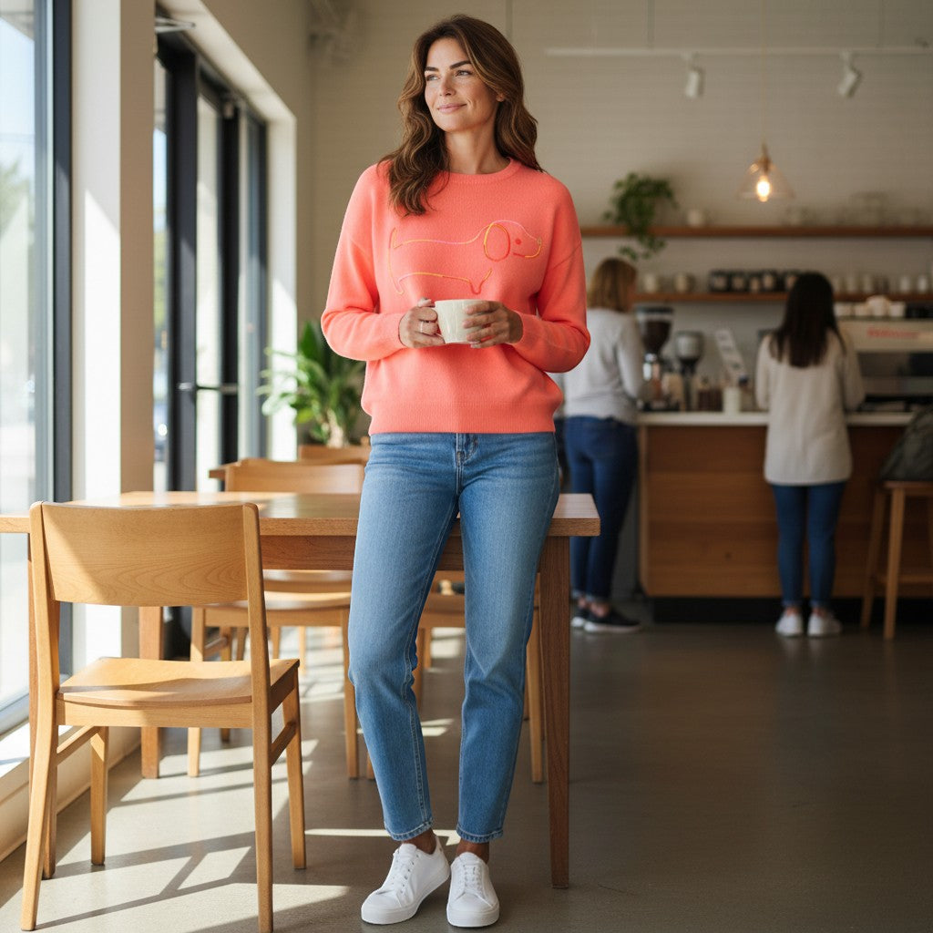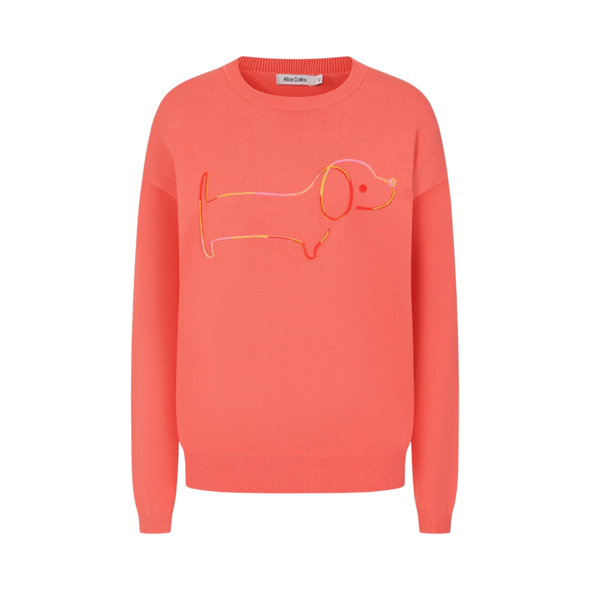 Add a playful touch to your wardrobe with the Alice Collins Sausage Dog Pullover. Crafted from a soft, comfortable knit, this vibrant coral sweater features a charming embroidered dachshund design in contrasting pink and yellow hues. Its classic crew neck and relaxed fit make it perfect for everyday wear. Pair it with jeans for a casual day out or layer it over a skirt for a fun, quirky ensemble. This eye-catching knit is sure to bring a smile to your face and those around you.