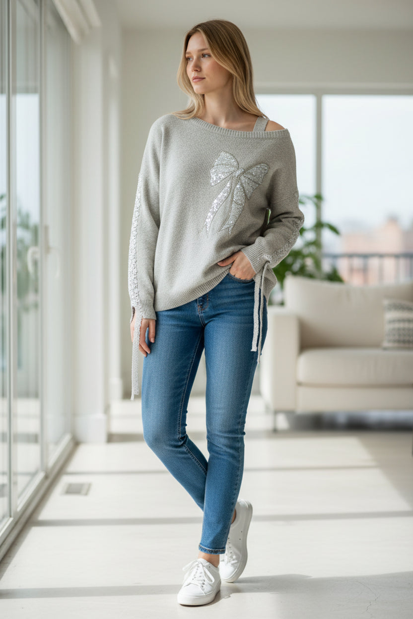 Wild Flower - Ladies - Bow Embroidered Jumper - Beige - Wildvine Clothing, Spalding, Lincolnshire